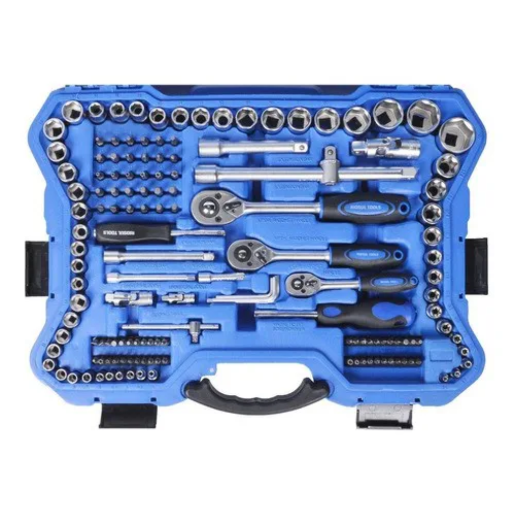 Jogo de soquetes, acessórios manuais e ferramentas.